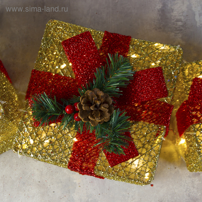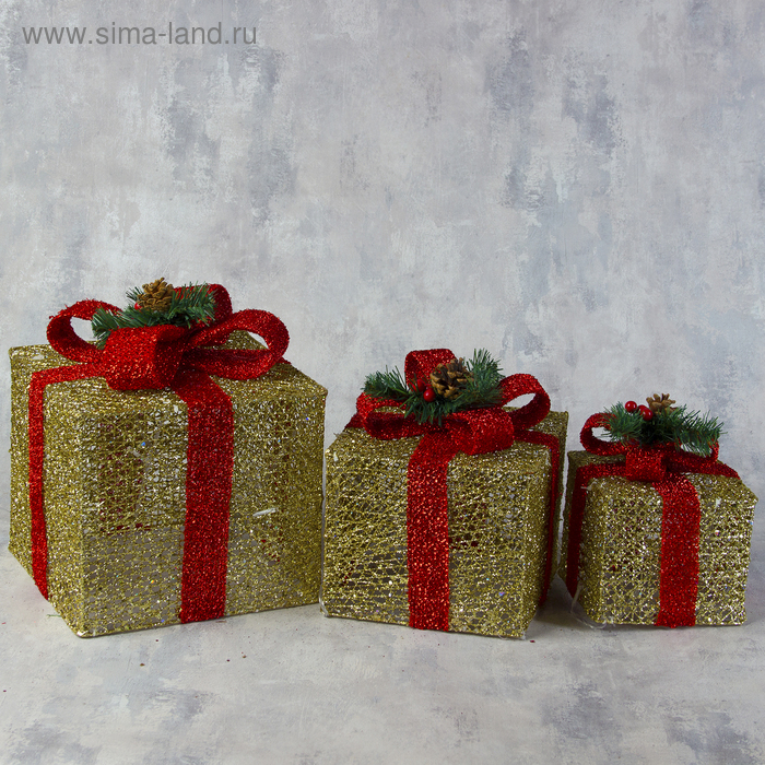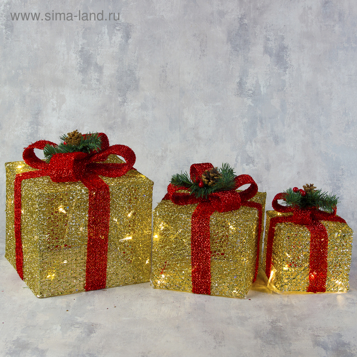 Светодиодная фигура «Подарки с красной лентой» 15, 20, 25 см, текстиль, металл, 220 В, свечение тёплое белое