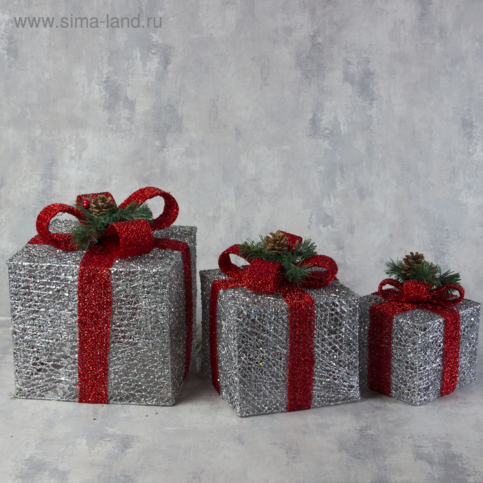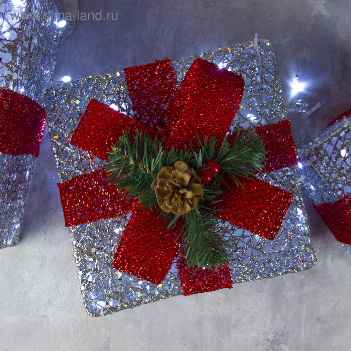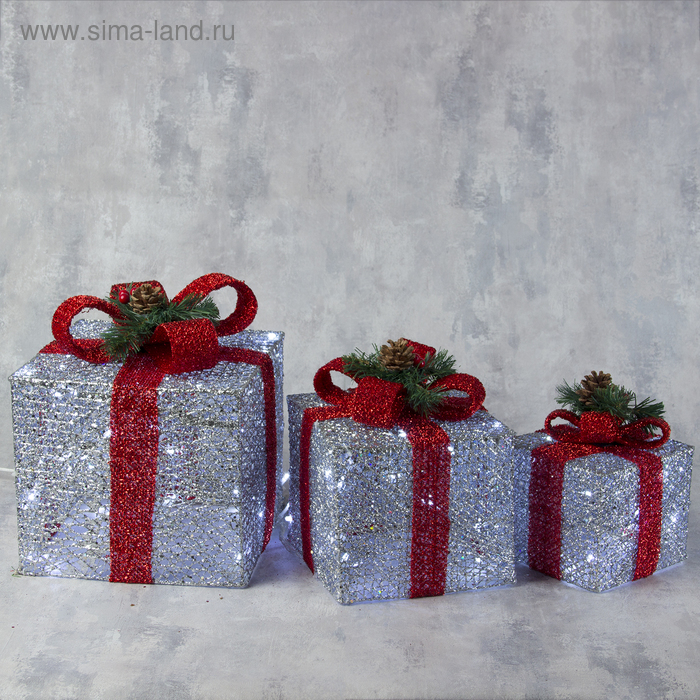 Светодиодная фигура «Подарки с красной лентой» 15, 20, 25 см, текстиль, металл, 220 В, свечение белое