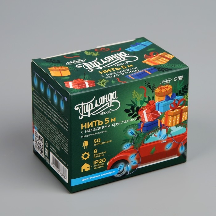 Гирлянда «Нить» 5 м с насадками «Хрусталики», IP20, прозрачная нить, 50 LED, свечение аквамарин, 8 режимов, 220 В