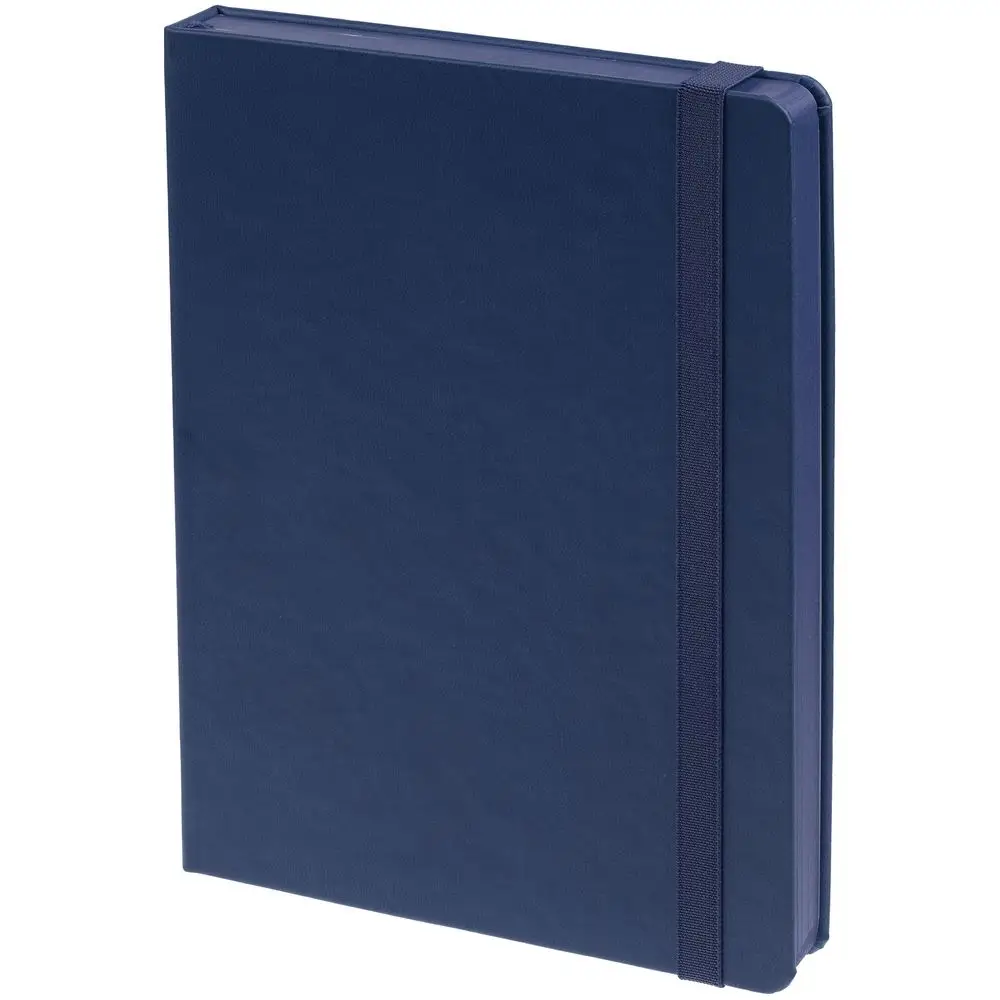 Ежедневник с твердой обложкой, выполнен из материала Latte, темно-синий ХХ, обрез темно-синего цвета, дополнен резинкой и ляссе темно-синего цвета.