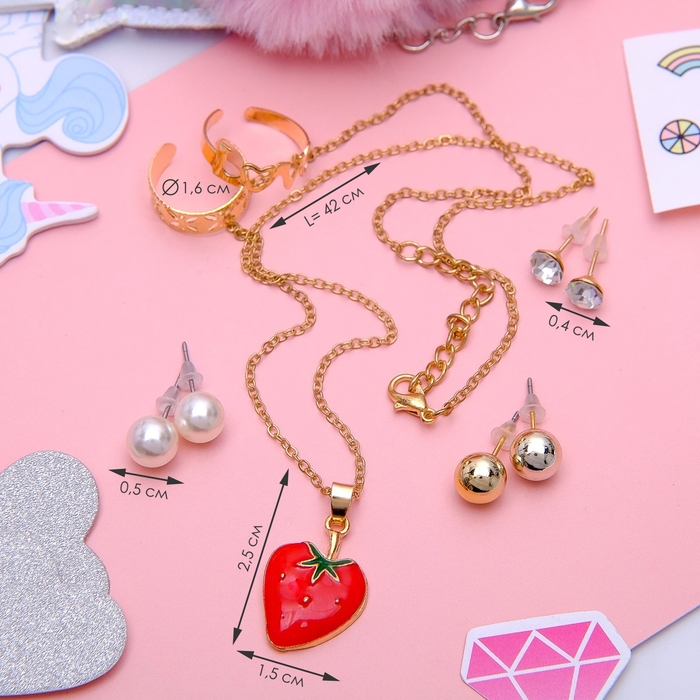 Гарнитур 6 предметов: 3 пары пусет, кулон 2 кольца «Ягодка», цвет красный в золоте, 40 см