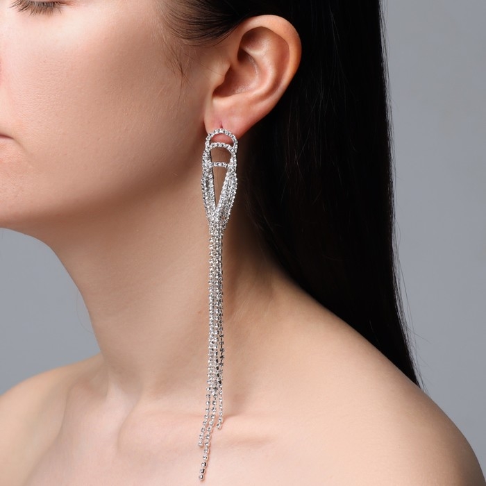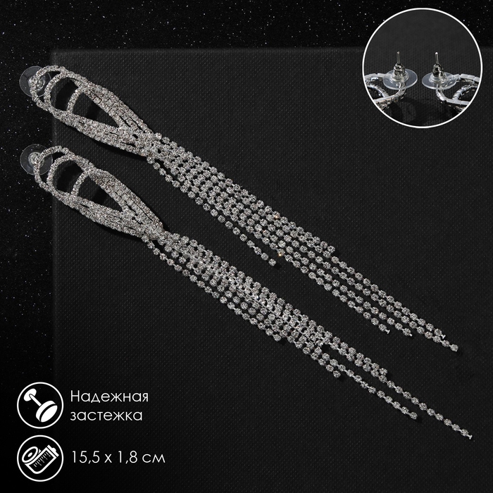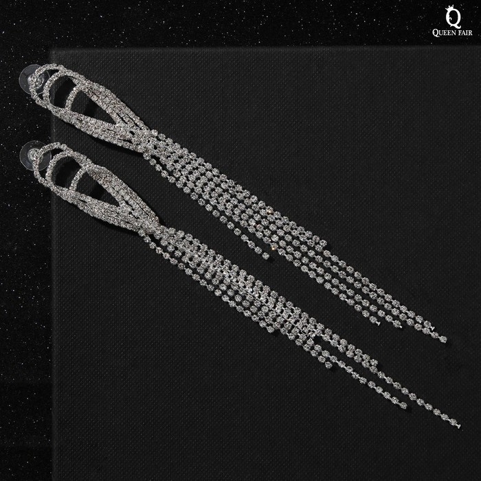 Серьги висячие со стразами «Голливуд» капли с нитями, цвет белый в серебре, 15,5 см