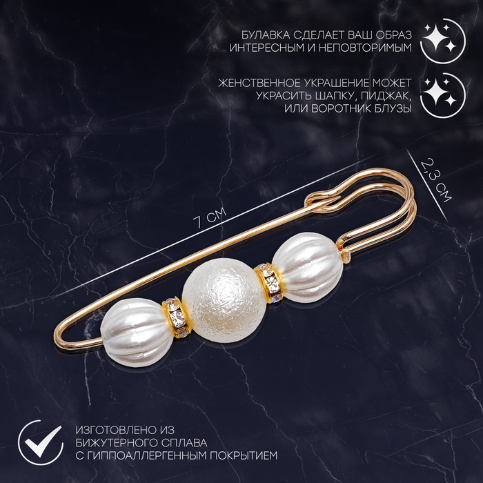 Булавка «Жемчужная россыпь» со стразами, 7,5 см, цвет белый в золоте