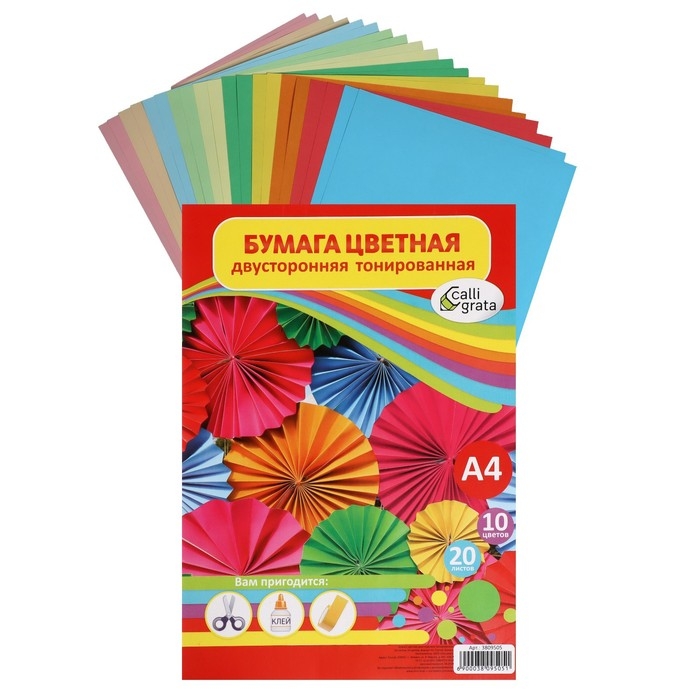 Бумага цветная двусторонняя А4, 20 листов, 10 цветов, тонированная