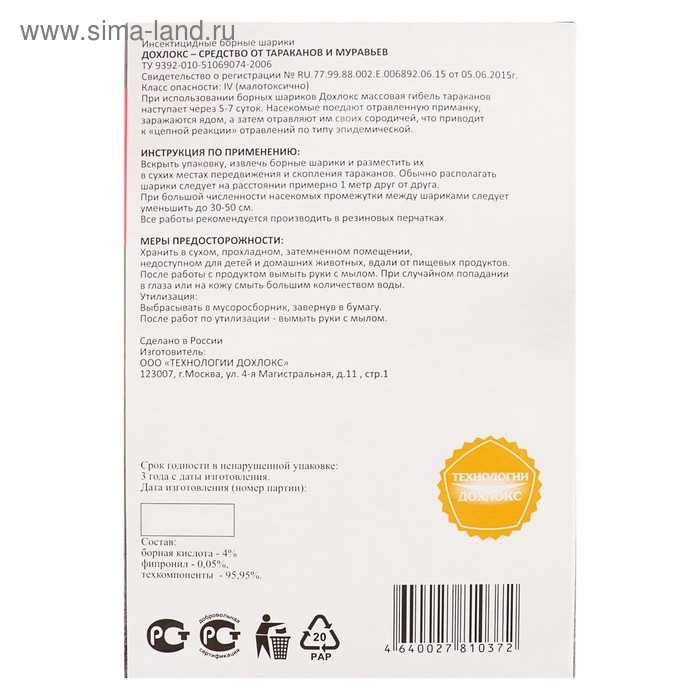 ОписаниеБОРНЫЕ ШАРИКИ «СГИНЬ!». Усиленные №56 для уничтожения массовых скопищ тараканов в квартирах ( 8 штук в упаковке) это самое известное народное средство от тараканов. В его состав входит настоящая борная кислота и фирменная пищевая приманка с ядом Дохлокс №56. Так что теперь это старое испытанное средство по уничтожению тараканов стало еще более эффективным и безотказным.Шарики следует вынуть из упаковки и разместить в местах появления и передвижения тараканов. Обычно располагать шарики следует на расстоянии примерно 1 метр друг от друга. При большой численности насекомых промежутки между шариками следует уменьшить до 30-50 см. Желательно не помещать в пыльные места. Не допускать контакта с маленькими детьми и домашними животными. После работы вымыть руки с мылом.СоставБорная кислота - 12%, фипронил - 0,05%, техкомпоненты - 87,95%.