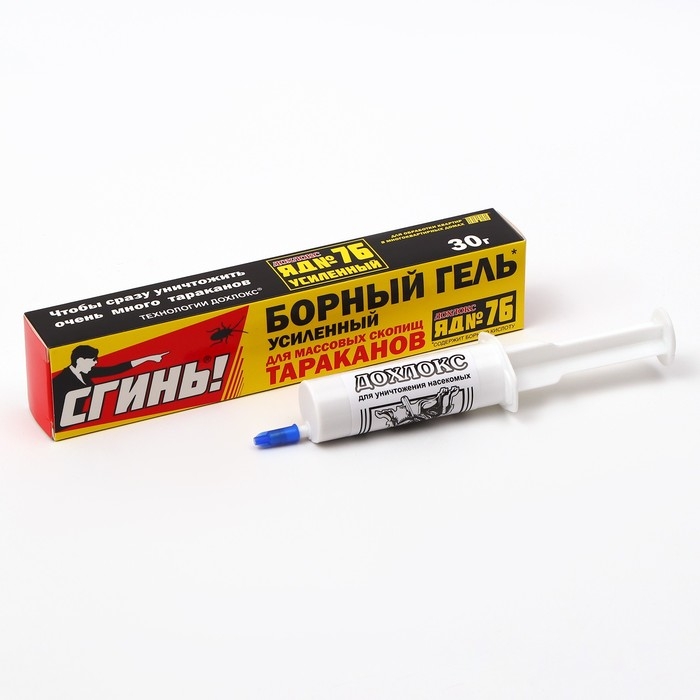 В состав геля входит борная кислота и фирменная пищевая приманка с ядом Дохлокс №76. По сравнению с другими гелями Дохлокс, эффективность этого геля еще более высокаяБорный гель следует выдавливать каплями и наносить по периметру помещений, а так же около вентиляционных и канализационных отверстий, мусоропровода, за батареями и т.п. Борный гель (усиленный) — это средство первичной ударной обработки для помещений с очень высокой степенью зараженности помещений тараканами.