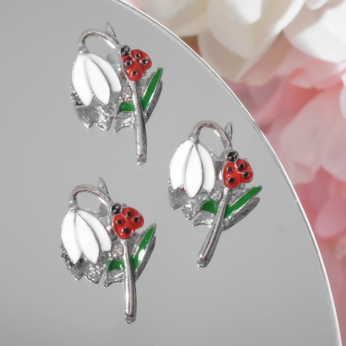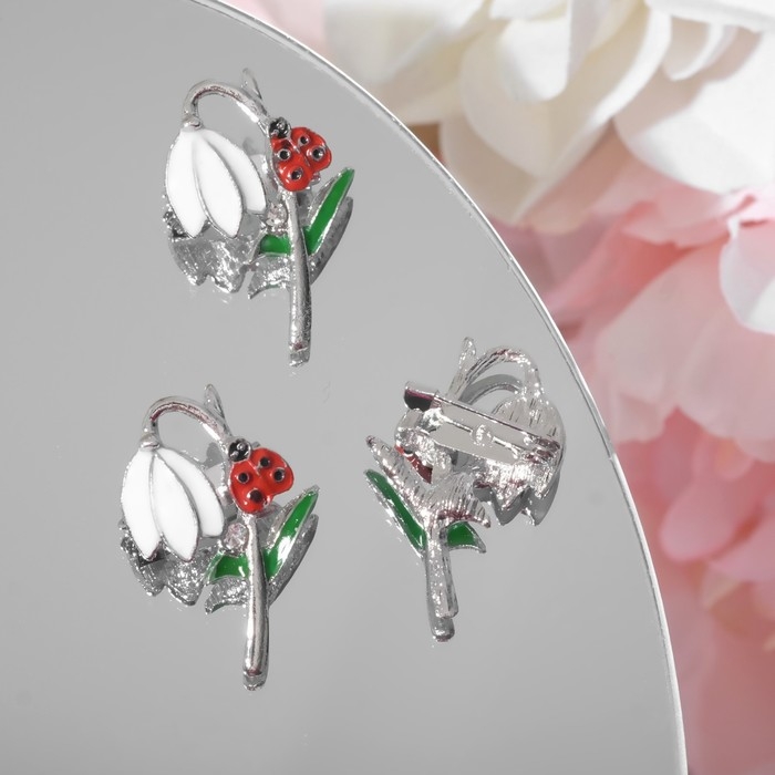 Брошь «Цветок подснежник» с божьей коровкой, цветная в серебре (неделимая фас.12шт, цена за шт)