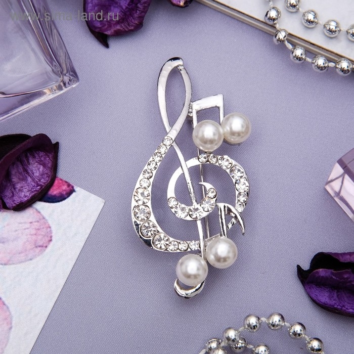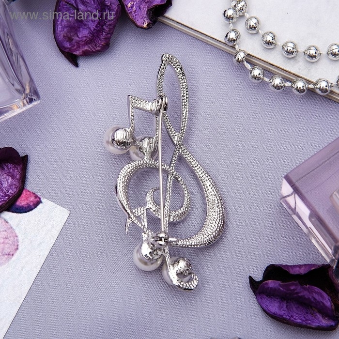Брошь «Скрипичный ключ» с жемчужными нотками, цвет белый в серебре