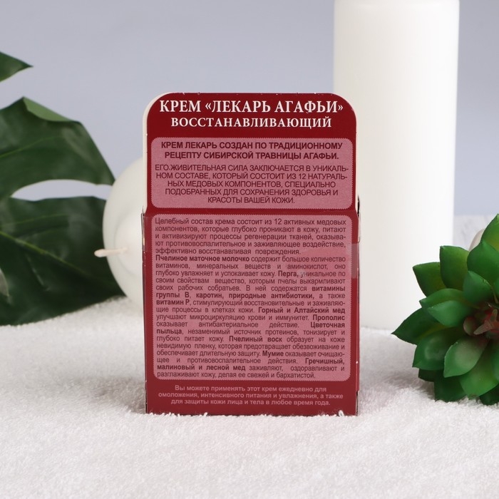Создан по традиционному рецепту сибирской травницы Агафьи. Его живительная сила заключается в уникальном составе, который состоит из 12 натуральных медовых компонентов, специально подобранных для сохранения здоровья и красоты Вашей кожи. Целебный состав крема состоит из 12 активных медовых компонентов, которые глубоко проникают в кожу, питают и активизируют процессы регенерации тканей, оказывают противовоспалительное и заживляющее воздействие, эффективно восстанавливая повреждения. Пчелиное маточное молочко содержит большое количества витаминов, минеральных веществ и аминокислот, оно глубоко увлажняет и успокаивает кожу. Перга, уникальное по своим свойствам вещество, которым пчелы выкармливают своих рабочих собратьев. В ней содержатся все витамины группы В, каротин, природные антибиотики, а также витамин Р, стимулирующий восстановительные и заживляющие процессы в клетках кожи. Горный и Алтайский мед улучшают микроциркуляцию крови и иммунитет. Прополис оказывает антибактериальное действие. Цветочная пыльца, незаменимый источник протеинов, тонизирует и глубоко питает кожу. Пчелиный воск образует на коже невидимую пленку, которая предотвращает обезвоживание и обеспечивает длительную защиту. Мумие оказывает очищающее и противовоспалительное действия. Гречишный, малиновый и лесной мед заживляют, оздоравливают и разглаживают кожу, делая ее свежей и бархатистой. Вы можете применять этот крем ежедневно, для защиты кожи лица и тела в любое время года, а также, как универсальный заживляющий и восстанавливающий крем для всей семьи!