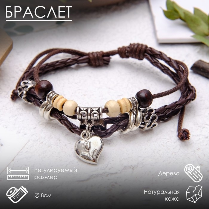 Браслет кожа «Переплетение» с подвеской, сердце, цвет коричневый, d=8 см