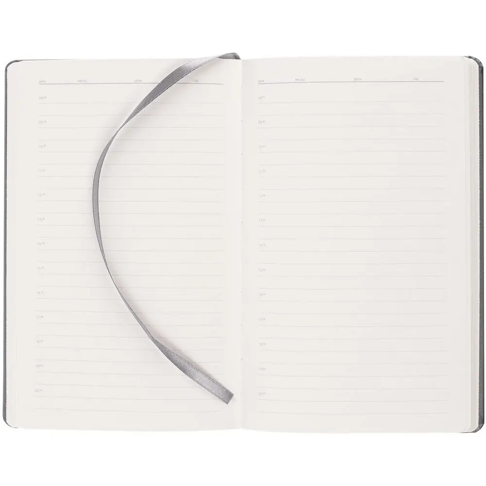 Ежедневник в твердой обложке, выполненной из материала Soft Touch Pearl, серый СС, дополнен цветным ляссе и магнитом, удерживающим ручку.