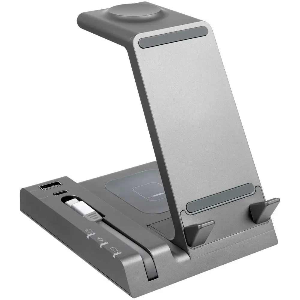Зарядная станция Tres высшего уровня сложности позволяет заряжать до 5 гаджетов одновременно: телефон, часы Apple Watch 2–8, наушники с поддержкой протокола беспроводной зарядки Quick Charge и еще 2 устройства через кабели с разъемами USB-А и Type-C.