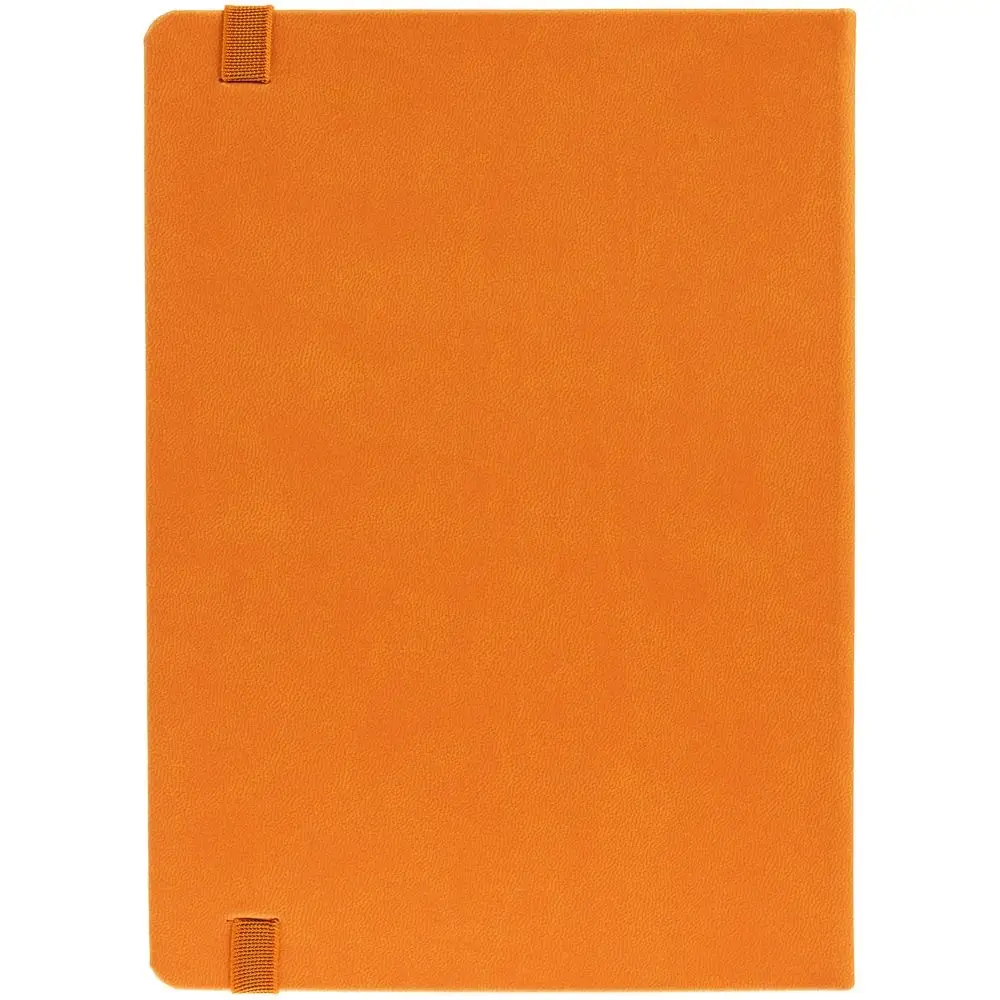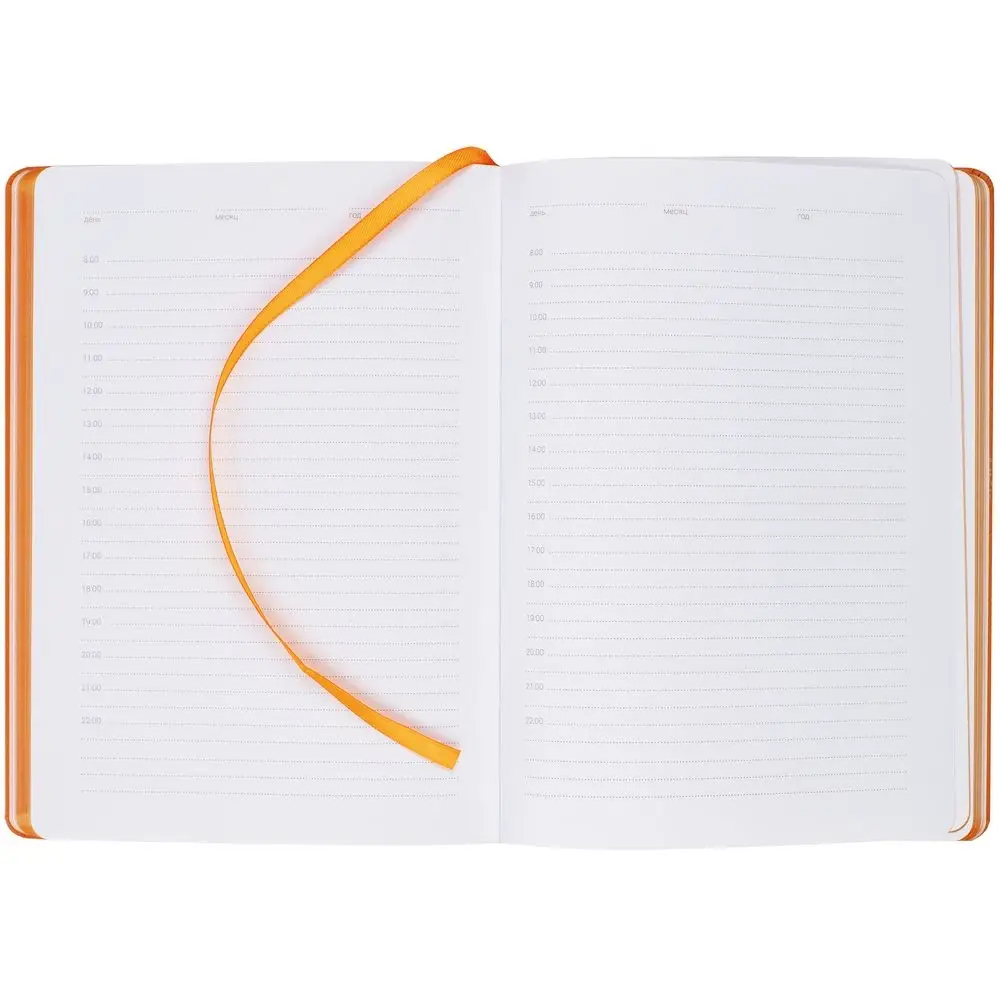 Ежедневник с твердой обложкой, выполнен из материала Latte, оранжевый ОО, обрез оранжевого цвета, дополнен ляссе оранжевого цвета и резинкой с металлическим шильдом.