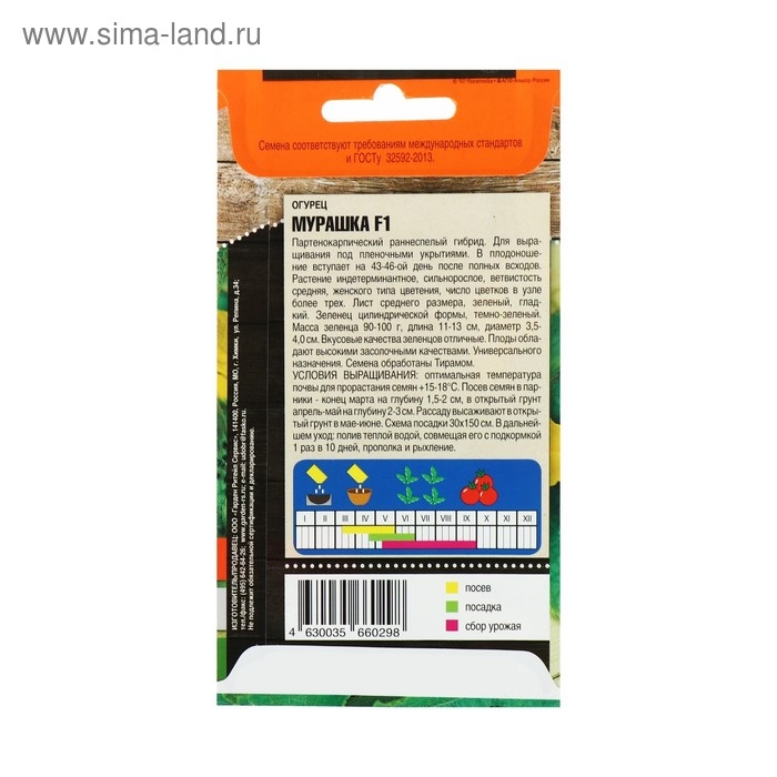 «F1 Мурашка» — это скороспелый партенокарпический гибрид женского типа цветения, у которого период от всходов до плодоношения составляет 43–48 дней. Устойчив к заболеваниям. Предназначен для защищённого и в открытого грунта.