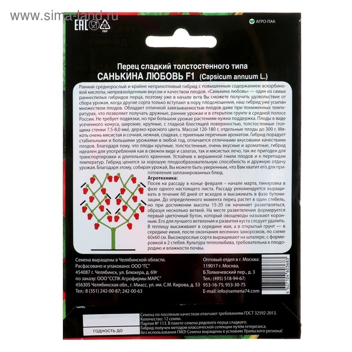 Семена Перец сладкий "Санькина любовь" F1, 12 шт