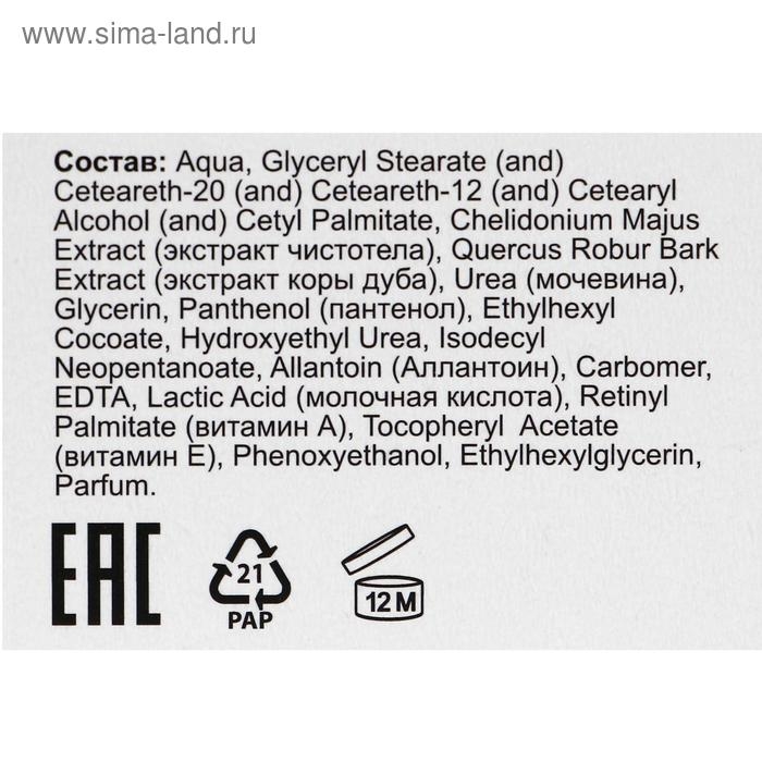 Состав: aqua, Glyceryl Stearate (and) Ceteareth-20 (and) Ceteareth-12 (and) Cetearyl Alcohol (and) Cetyl Palmitate, Chelidonium Majus Extract ( Экстр. Чистотела), Quercus Robur Bark Extract (Экстр. Коры дуба), Urea (мочевина), Glycerin, Panthenol (Пантенол), Ethyl Hexyl Cocoate, Hydroxyethylurea, Isodecyl Neopentanoate, Allantoin (Аллантоин), Carbomer, Melaleuca Alternifolia Leaf Oil (эфирное масло чайного дерева), EDTA, Lactic Acid (молочная кислота), Retinyl Palmitate (витамин А), Tocopheryl Acetate (витамин Е), 2-bromo-2-nitropropane-1,3-diol, Parfum.