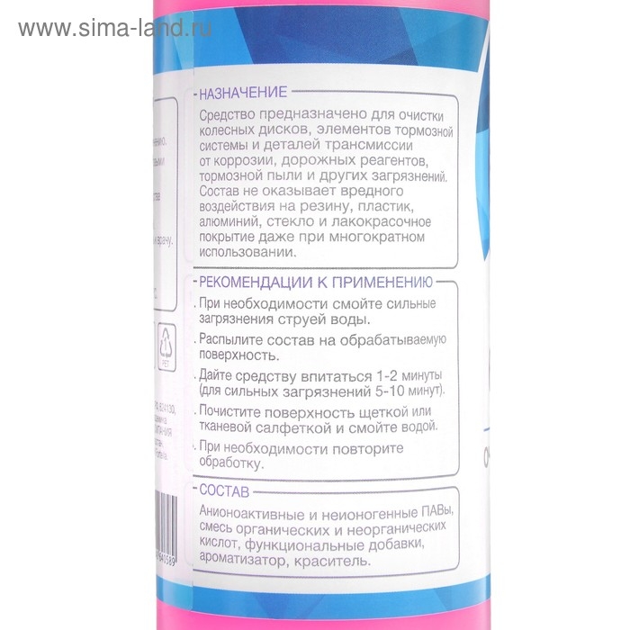 Средство предназначено для очистки колесных дисков, элементов тормозной системы и деталей трансмиссии от коррозии, дорожных реагентов, тормозной пыли и других загрязнений.