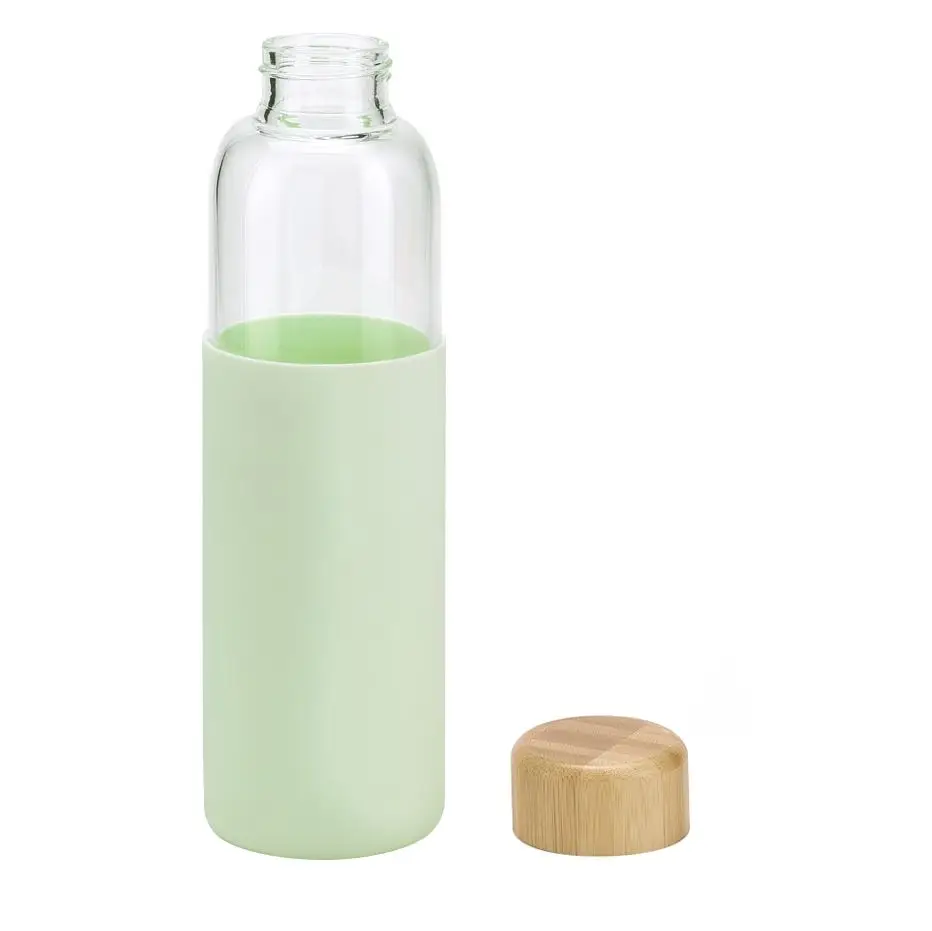 Бутылка со стеклянной колбой и крышкой из бамбука — изящное решение для тех, кто предпочитает природные материалы. Яркий силиконовый чехол защищает колбу от повреждений.