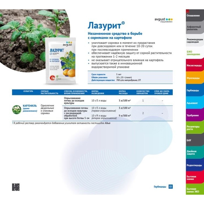 Одним из эффективных средств для борьбы с сорняками на посадках картофеля является Лазурит. Это гербицид, который быстро и эффективно уничтожает многолетние и однолетние сорняки.