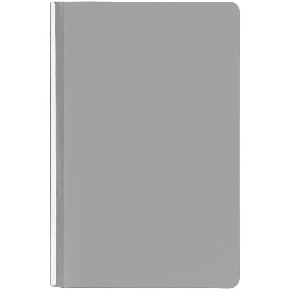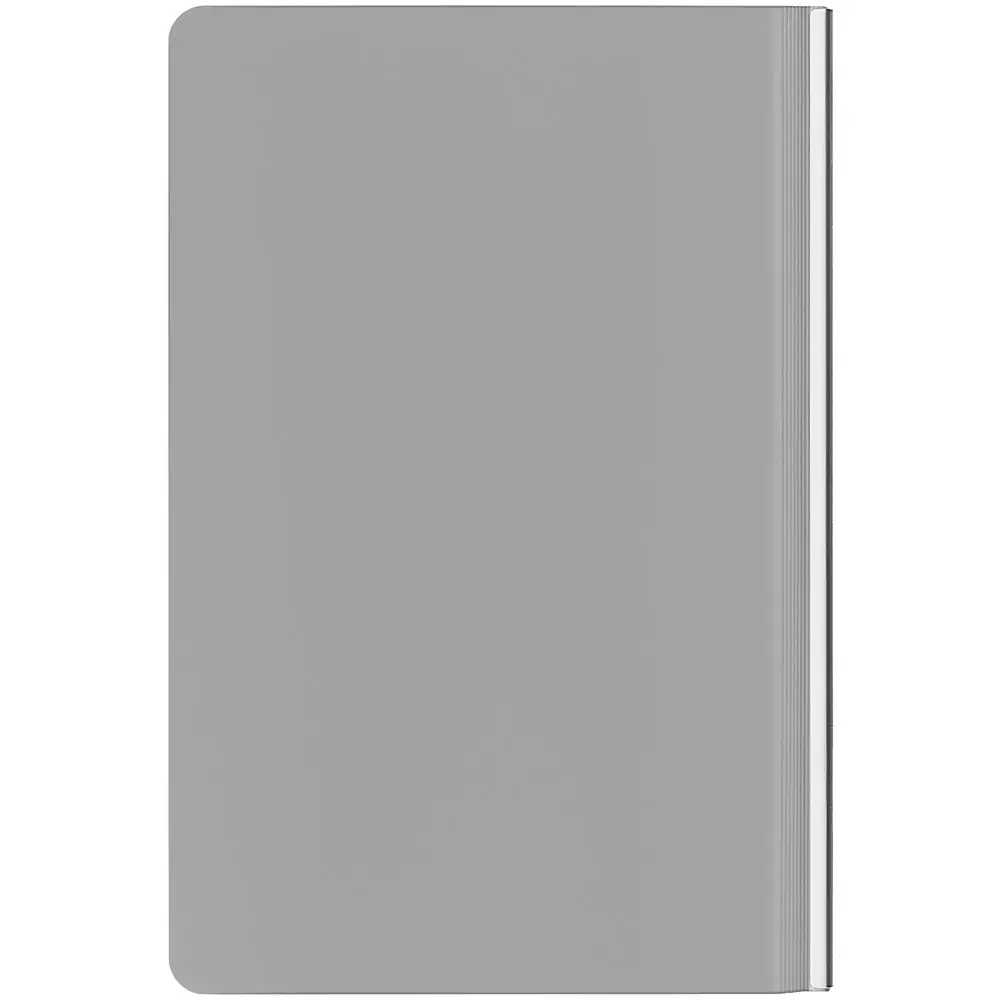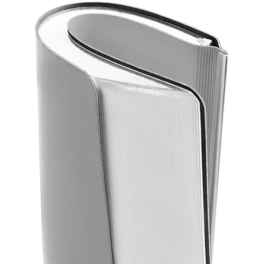 Зауженный ежедневник с гибкой обложкой и металлическим корешком, выполнен из материала Soft Touch, серый СС, дополнен серебристым обрезом блока и ляссе.