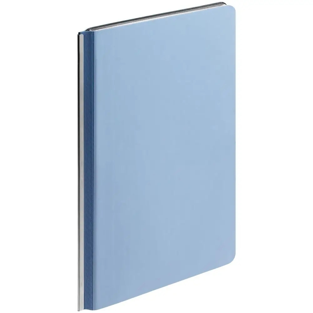 Ежедневник с гибкой обложкой и металлическим корешком, выполнен из материала Soft Touch, голубой JJ, дополнен серебристым обрезом блока и ляссе.