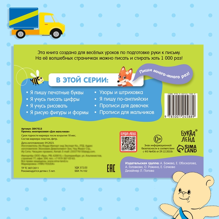 Прописи созданы специально для мальчиков. Малыши смогут многократно писать, стирать и учиться на своих ошибках, что делает процесс обучения не только полезным, но и интересным.