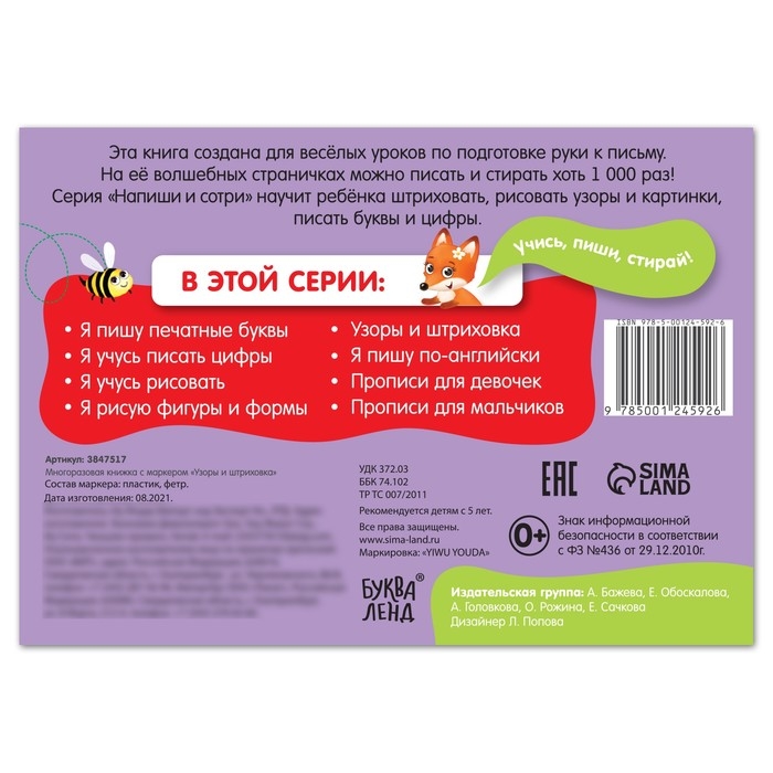 Многоразовая пропись «Пиши-стирай. Узоры и штриховка» — отличный способ для ребёнка освоить навыки письма в увлекательной форме. В комплекте 12 страниц с заданиями и специальный маркер, который позволяет многократно стирать написанное и начинать заново. Это отличное решение для малышей, которые только начинают учиться писать.