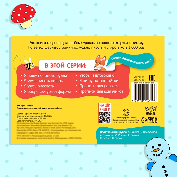 Многоразовая пропись «Пиши-стирай. Я учусь писать цифры» — отличный способ для ребёнка освоить навыки письма в увлекательной форме. В комплекте 12 страниц с заданиями и специальный маркер, который позволяет многократно стирать написанное и начинать заново. Это отличное решение для малышей, которые только начинают учиться писать.