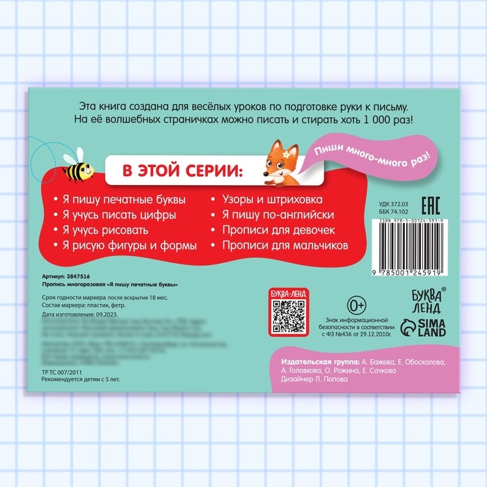 Многоразовая пропись «Пиши-стирай. Я пишу печатные буквы» — отличный способ для ребёнка освоить навыки письма в увлекательной форме. В комплекте 12 страниц с заданиями и специальный маркер, который позволяет многократно стирать написанное и начинать заново. Это отличное решение для малышей, которые только начинают учиться писать.