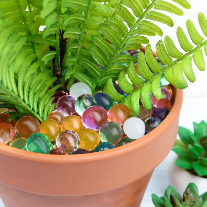 Аквагрунт или экопочва – разновидность гидрогеля (полимера с уникальными свойствами). Имеет форму плотного шарика. При опускании в воду, начинает увеличиваться в размерах, задерживая в себе влагу. Аквагрунт безопасен для растений, в нем не разводятся мушки, жучки и другие паразиты, поскольку имеет химическое, а не природное происхождение. Он отлично подходит для сохранения красоты срезанных букетов. Преимуществом аквагрунта является то, что его можно использовать несколько раз так, как он теряет свои свойства примерно через год-полтора после наполнения влагой. Аквагрунт используют не только как добавку к почве, но и в чистом виде. Важно помнить, что он не обладает питательными веществами, а лишь улучшает свойства самой почвы, ее аэрацию и газообмен. Для пересадки в такую среду подойдут лишь влаголюбивые растения, которые необходимо вручную удобрять. Суккуленты и кактусы не входят в это число.