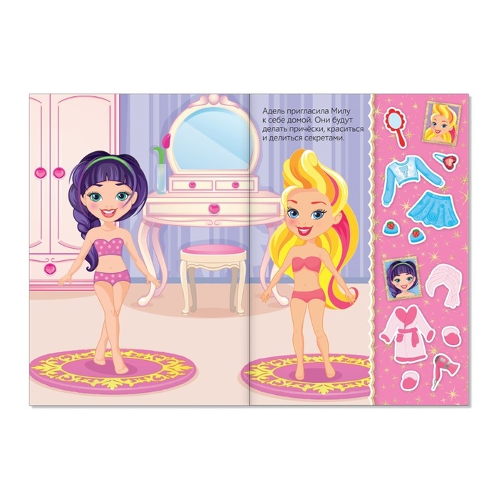 В книге ребёнка ждёт более 100 цветных наклеек с одеждой и аксессуарами для кукол.