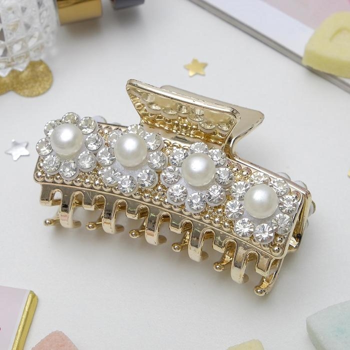 Краб для волос "Манифик" цветы из страз с бусинами, 8 см, золото