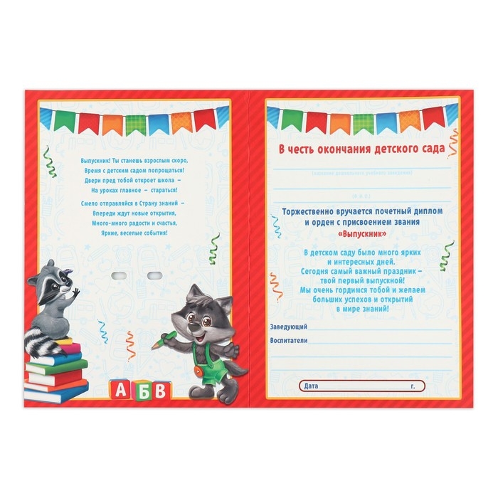 Такой яркий наградной набор, состоящий из диплома и ордена, не оставит ни одного ребенка равнодушным, поможет сделать выпускной особенно торжественным и останется на долгую память выпускнику.