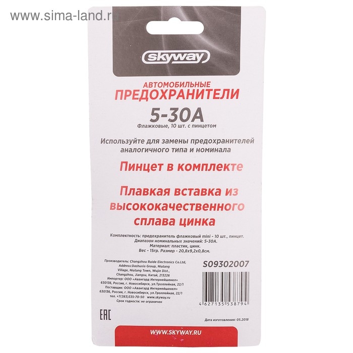 Предохранитель флажковый Skyway, "средний", 5-30 А, блистер, набор 10 шт