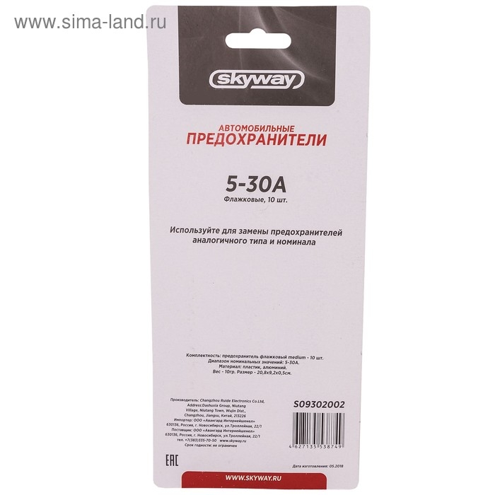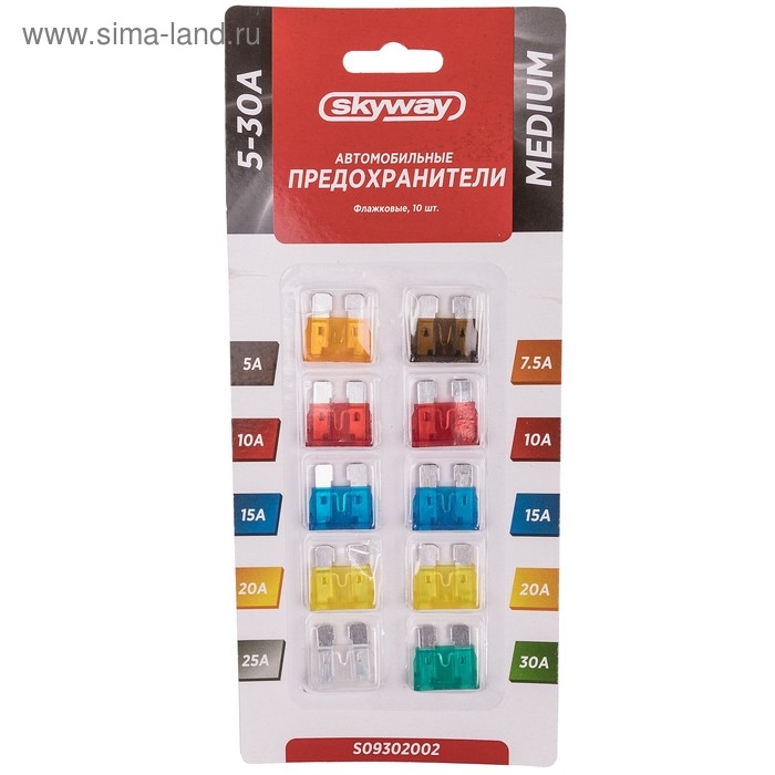 Предохранитель флажковый Skyway, "средний", 5-30 А — набор пластмассовых предохранителей, предназначенных для защиты бортовой электрической цепи автомобиля от перегрева и коротких замыканий. Изготовлены из термостойкой пластмассы с вставками из цинка. Важнейшая деталь для Вашего автомобиля.