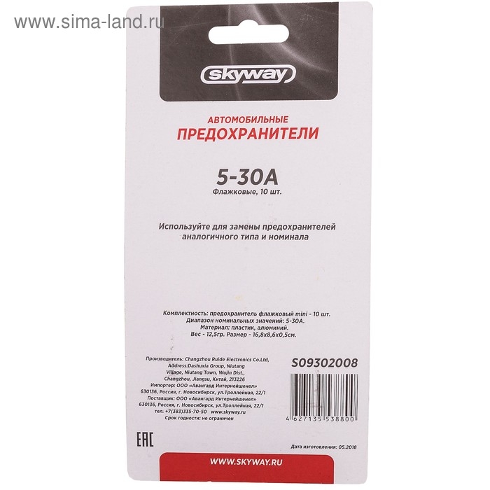 Предохранитель флажковый Skyway, "средний", 5-30 А, блистер, набор 10 шт