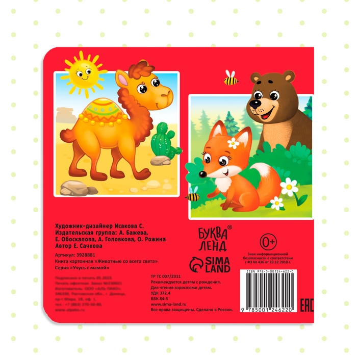 Картонная книга «Животные со всего света» — это идеальный выбор для развития любознательности вашего малыша! Красочная и познавательная книга для малышей, которая познакомит ребёнка с животными разных континентов.