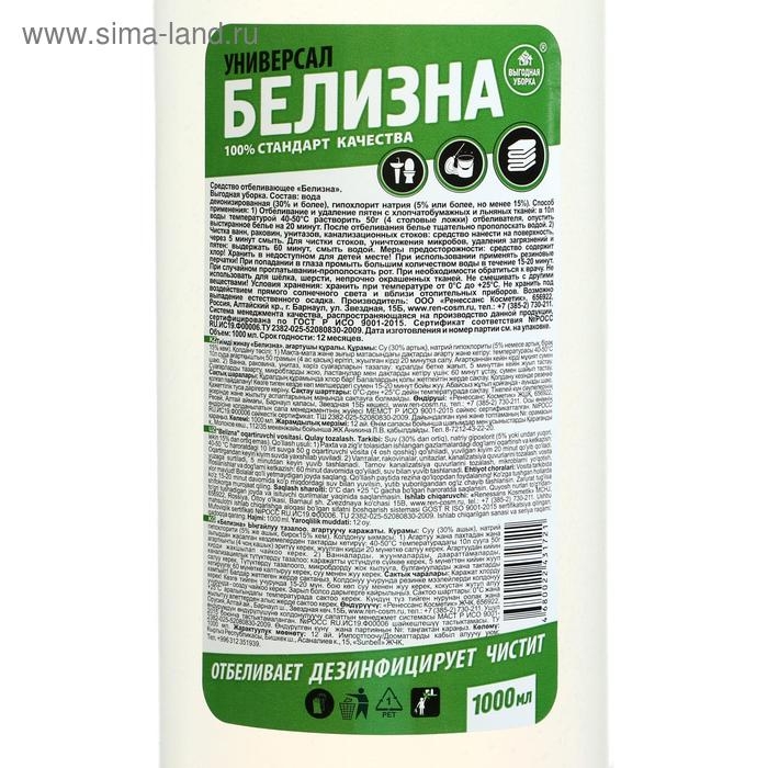 Хлоросодержащее средство «Белизна» универсал применяется для отбеливания и удаления пятен с тканей, чистки ванн, раковин, унитазов, канализационных стоков, мытья пола, кафеля. Эффективно удаляет загрязнения, устраняет неприятный запах и уничтожает микробов. Подходит для стирки, замачивания, отбеливания вещей. Эффективна при чистке унитазов, душевых кабин, устраняет въевшиеся загрязнения.