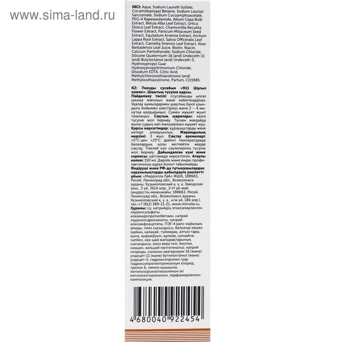 Состав: вода, лаурилсульфат натрия этоксилированный, кокамидопропилбетаин, лауроилсаркозинат натрия, кокоамфоацетат натрия, ПЭГ-4 амид рапсового масла, экстракт лука, экстракт листа березы, экстракт листа крапивы, экстракт цветков ромашки, экстракт семян проса, экстракт хвоща, экстракт корней лопуха, экстракт листьев шалфея, экстракт листьев зелёного чая, гель алоэ вера, биотин, ниацин, пантотенат кальция, натрия хлорид, силикон кватерниум-16 (и) ундецет-11 (и) бутилоктанол (и) ундецет-5, гидроксипропил гуар гидроксипропилтримониум хлорид, трилон Б, лимонная кислота, метилхлороизотиазолинон (и) метилизотиазолинон, парфюмерная композиция, краситель Cl15985.