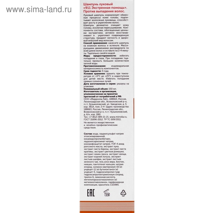 Шампунь 911 "Луковый" от выпадения волос и облысения, 150 мл