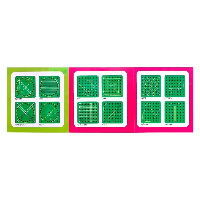 В наборе идет планшет со штырьками (можно использовать самостоятельно), брошюра со схемами, 6 игровых полей и лист с фишками, который сделает игру ещё интереснее.