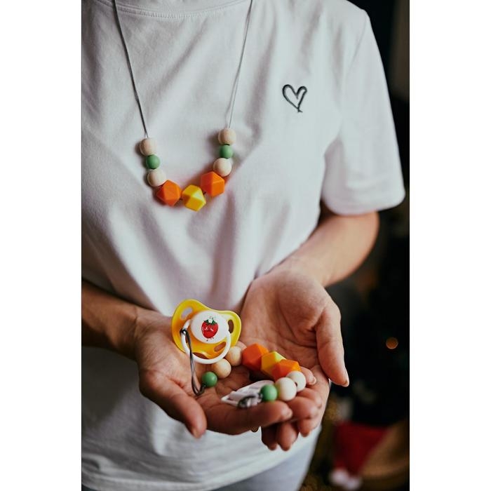 Изделие фиксируется на одежде ребёнка. На конце цепочки есть карабин, который зацепляется за кольцо пустышки. Надёжное крепление убережёт вещь от падения на пол, если малютка случайно выронит её изо рта.