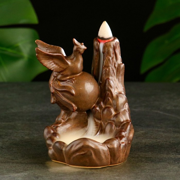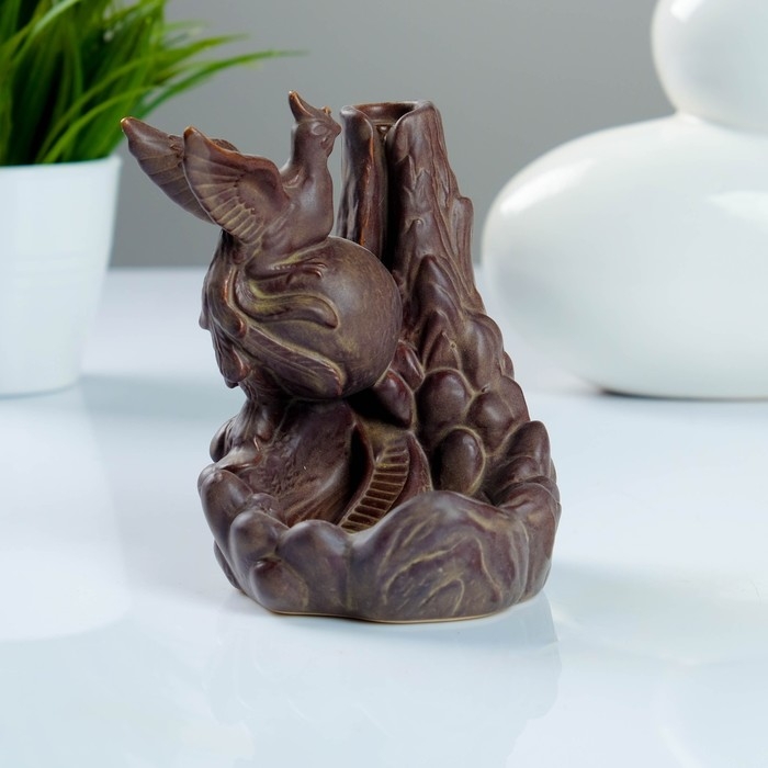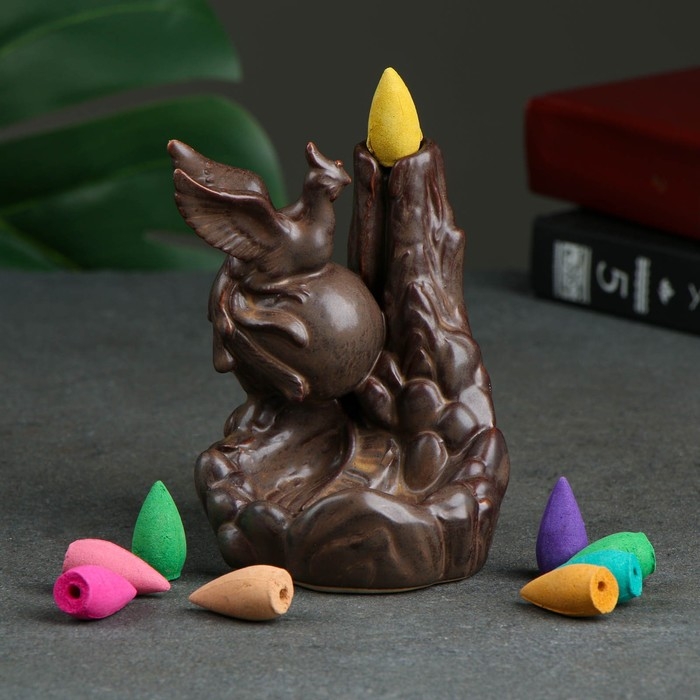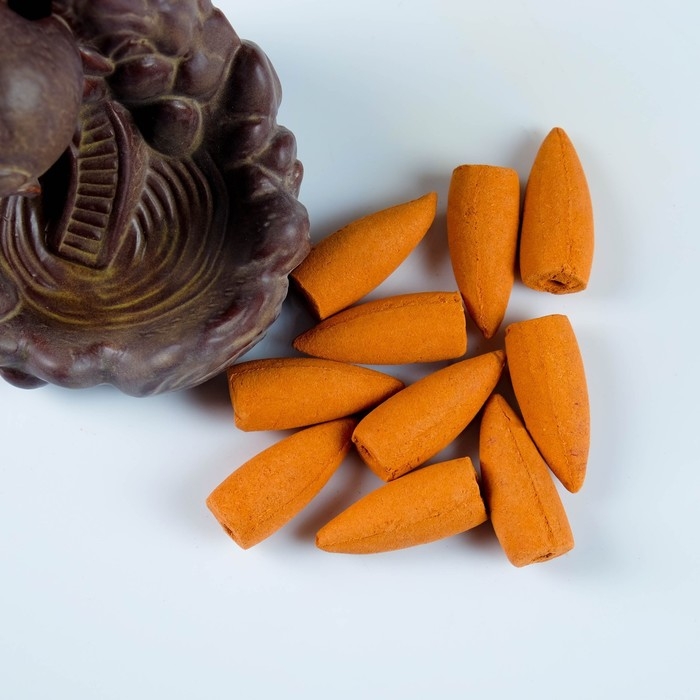 В набор входит 10 конусов и фигурная керамическая подставка. Когда благовония тлеют, дым стелется по основанию фигуры, создавая эффект водопада. Пепел остаётся на подставке и не падает на мебель.