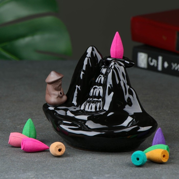 В набор входит 10 конусов и фигурная керамическая подставка. Когда благовония тлеют, дым стелется по основанию фигуры, создавая эффект водопада. Пепел остаётся на подставке и не падает на мебель.