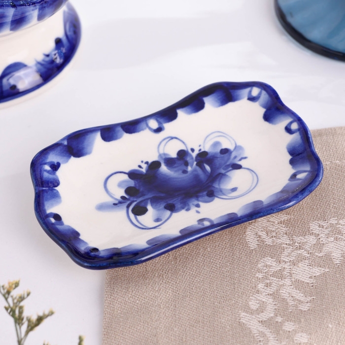 Собственный стиль Гжели — синие и голубые узоры, растительный орнамент и витиеватые украшения на белом фоне. В каждом предмете легко и непринуждённо варьируются букеты и гирлянды, вводятся геометрические пояски, похожие на вязаное кружево, изделия украшает декоративная лепнина, изображаются пейзажные сюжеты.