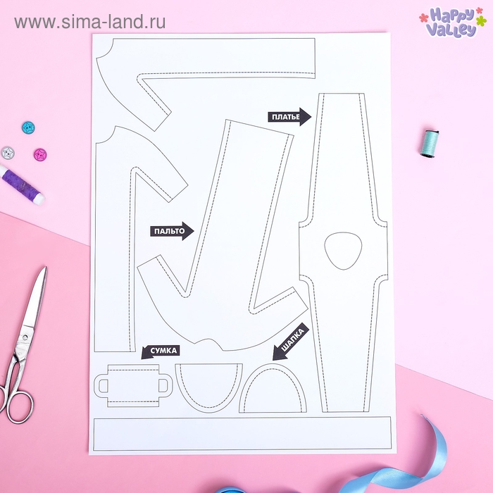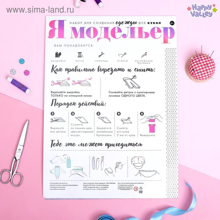 В набор входят лекала будущей одежды, ткань и инструкция с основами швейного мастерства.