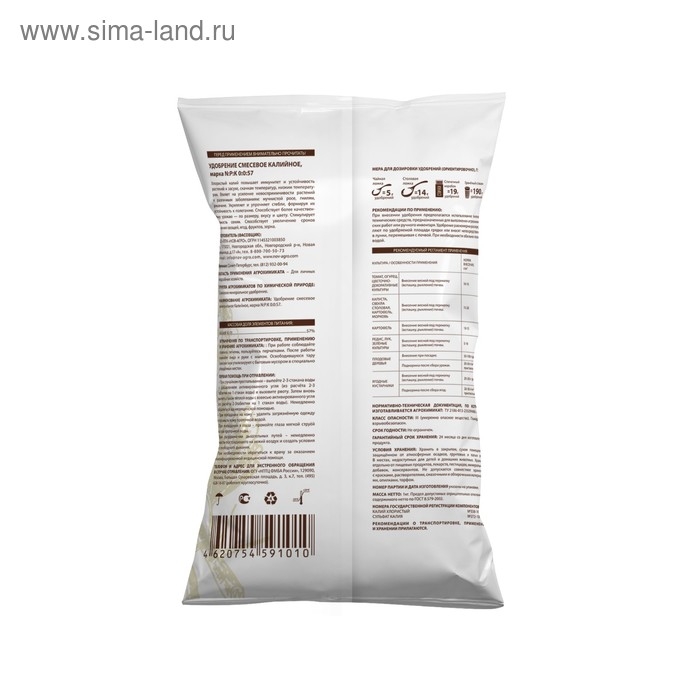 Высококонцентрированное калийное удобрение, особенно эффективно при выращивании картофеля и других овощных культур, плодово-ягодных и декоративных насаждений.