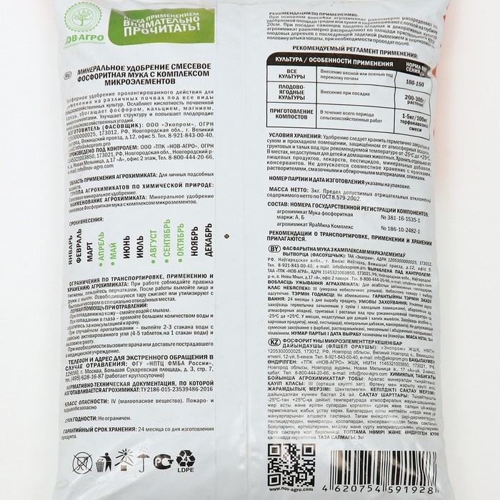 Фосфоритная мука 3 кг – универсальное удобрение пролонгированного действия. Подойдет для использования на всех видах почв. Способствует снижению кислотности почвы, обогащает её фосфором, кальцием, магнием и полезными микроэлементами. Средство позволяет улучшить качество и структуру грунта, а также повышает плодородие. Вносят фосфоритную муку весной или осенью. Достоинства: обладает длительным последействием, не слеживается, хорошо рассеивается, экологически безвредна: Фосфоритную муку можно смешивать с другими удобрениями.