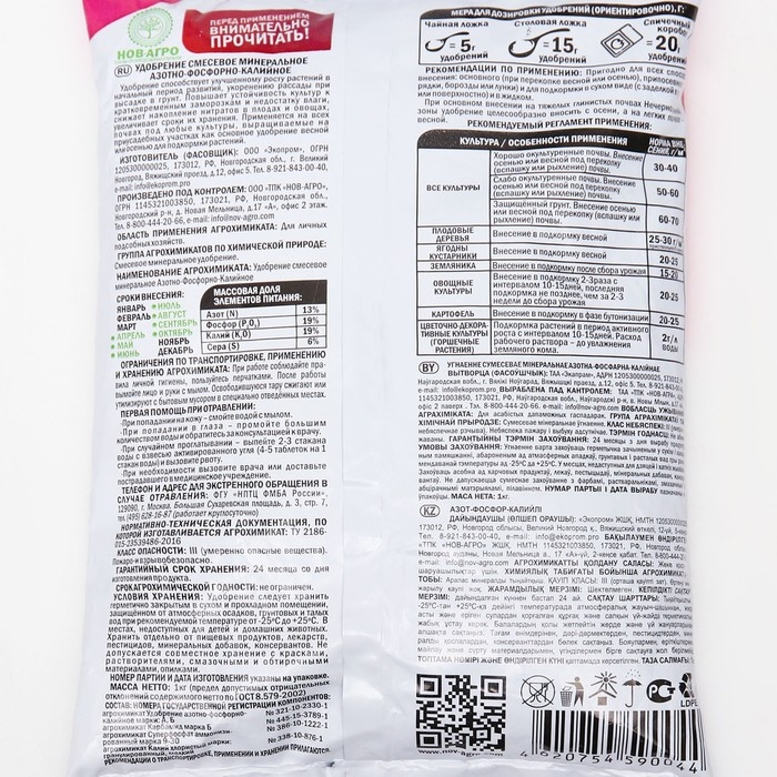 Состав: N-13%, P2O5 – 19%, K2O – 19%.