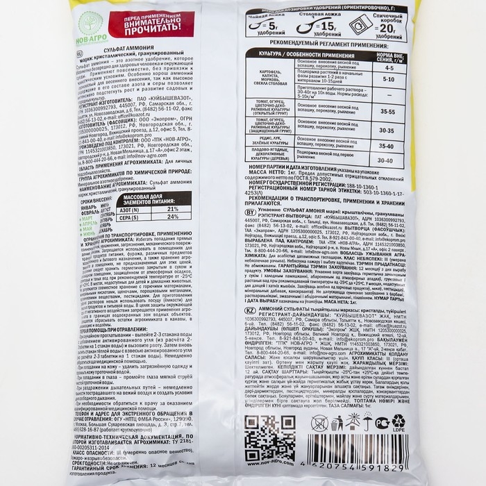 Удобрение «Сульфат аммония» положительно сказывается на росте любых корнеплодов, кустарников и цветов. Высокое содержание азота и серы подстегивает рост и развитие растений. Улучшает вкус и увеличивает сроки хранения урожая. Безвредно для человека и окружающей среды.
